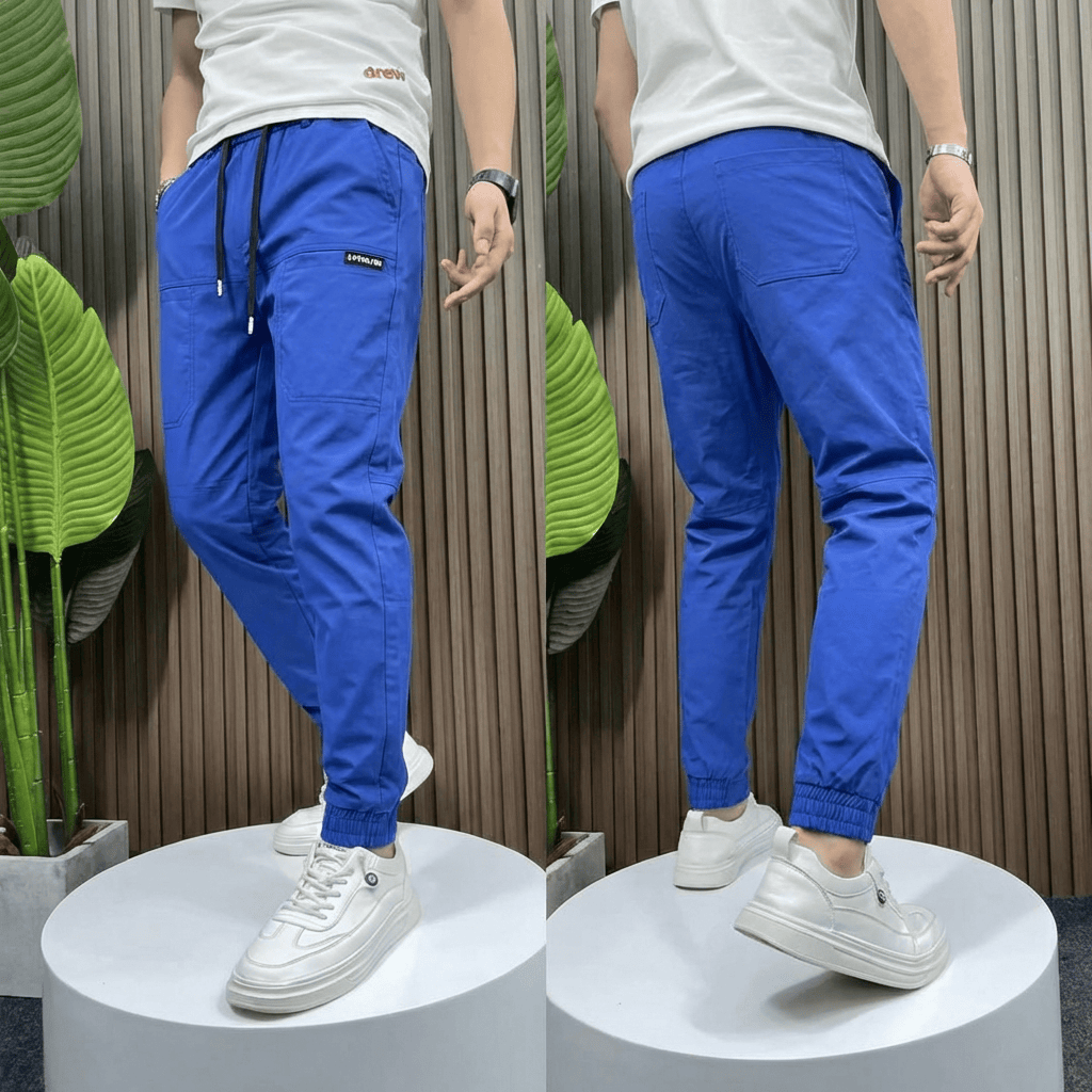 Featuring discreet cargo-style pockets that sit flat against the leg, these pants deliver practical storage without disrupting the silhouette. The lightweight stretch-woven fabric allows unrestricted movement, while the slim-tapered cut and ribbed ankle cuffs maintain a sharp, streamlined finish.
